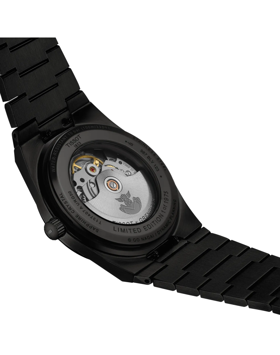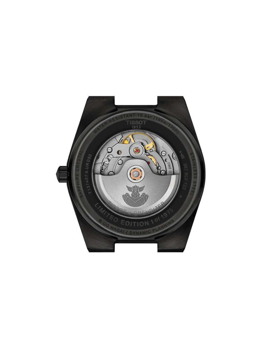 Tissot PRX UFO Robot Grendizer 50th Anniversary 40mm Materyal: Siyah PVD kaplamalı 316L paslanmaz çelik kasa Cam: Çift taraflı antirefle çizilmeye dayanıklı safir kristal cam Kordon: Paslanmaz çelik Hareket: İsviçre otomatik Enerji: Otomatik Güç Rezervi: 80 saatlik güç rezervi Fonksiyon: Patentli Nivachron denge yayı